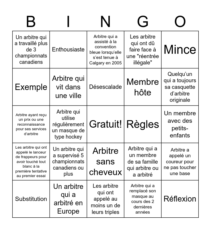 This bingo card has a free space and 24 words: Un arbitre qui a supervisé 5 championnats canadiens ou plus, Un arbitre qui a arbitré en Europe, Désescalade, Substitution, Mince, Un arbitre qui a travaillé plus de 3 championnats canadiens, Exemple, Enthousiaste, Règles, Arbitre sans cheveux, Membre hôte, Arbitre ayant reçu un prix ou une reconnaissance pour ses services d’arbitre, Arbitre qui a un membre de sa famille qui arbitre ou a arbitré, Arbitre a appelé un coureur pour ne pas toucher une base, Arbitre qui vit dans une ville, Arbitre qui a remplacé son masque au cours des 2 dernières années, Un membre avec des petits-enfants, Arbitre qui a assisté à la convention bleue lorsqu’elle s’est tenue à Calgary en 2005, Quelqu’un qui a toujours sa casquette d’arbitre originale, Arbitre qui utilise régulièrement un masque de type hockey, Réflexion, Les arbitre qui ont appelé le lanceur de frappeurs pour avoir touché tout blanc à la première tentative au premier essai, Les arbitre qui ont dû faire face à une "réentrée illégale" and Les arbitre qui ont appelé au moins un de leurs triples.