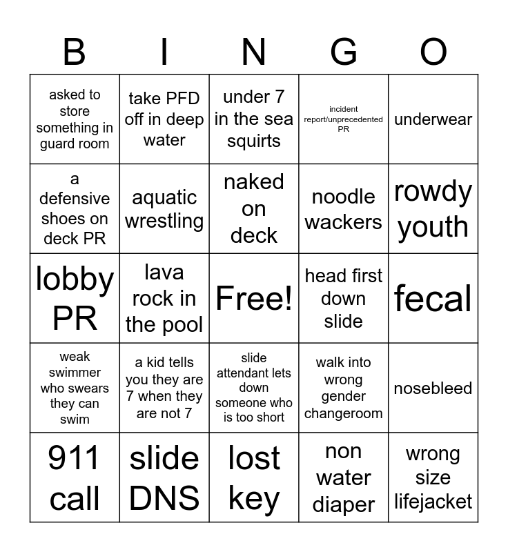 This bingo card has a free space and 24 words: a kid tells you they are 7 when they are not 7, slide DNS, naked on deck, 911 call, underwear, asked to store something in guard room, a defensive shoes on deck PR, take PFD off in deep water, head first down slide, slide attendant lets down someone who is too short, noodle wackers, lobby PR, walk into wrong gender changeroom, nosebleed, aquatic wrestling, non water diaper, fecal, under 7 in the sea squirts, rowdy youth, lava rock in the pool, wrong size lifejacket, weak swimmer who swears they can swim, incident report/unprecedented PR and lost key.