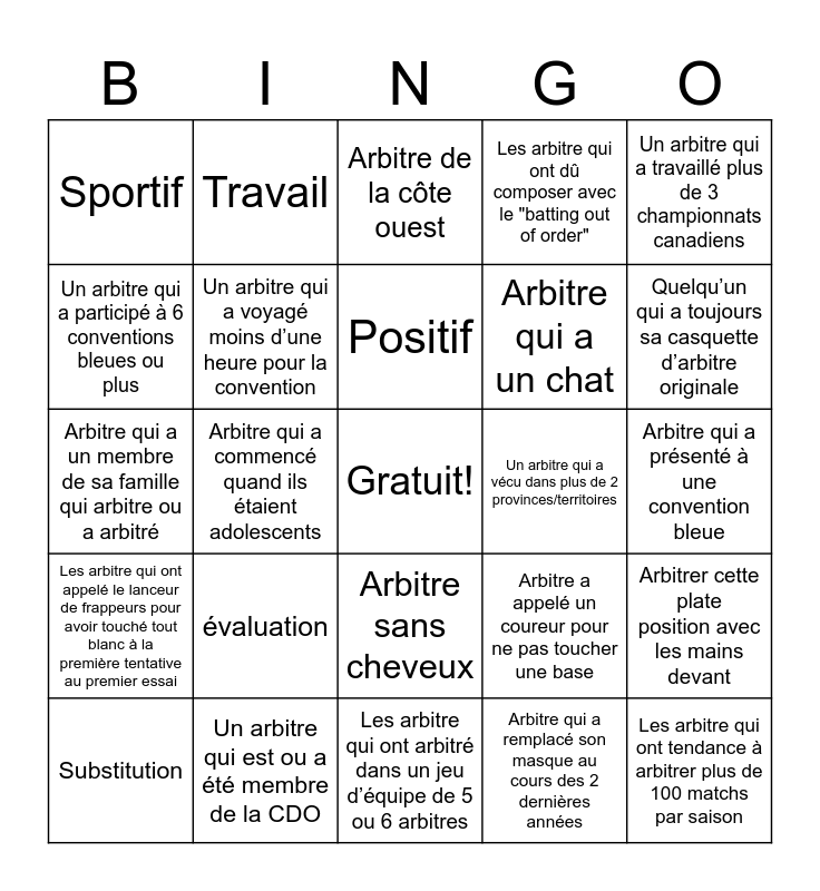 This bingo card has a free space and 24 words: évaluation, Un arbitre qui est ou a été membre de la CDO, Positif, Substitution, Un arbitre qui a travaillé plus de 3 championnats canadiens, Sportif, Un arbitre qui a participé à 6 conventions bleues ou plus, Travail, Un arbitre qui a vécu dans plus de 2 provinces/territoires, Arbitre sans cheveux, Arbitre qui a un chat, Arbitre qui a un membre de sa famille qui arbitre ou a arbitré, Arbitre a appelé un coureur pour ne pas toucher une base, Arbitrer cette plate position avec les mains devant, Un arbitre qui a voyagé moins d’une heure pour la convention, Arbitre qui a remplacé son masque au cours des 2 dernières années, Arbitre qui a présenté à une convention bleue, Arbitre de la côte ouest, Quelqu’un qui a toujours sa casquette d’arbitre originale, Arbitre qui a commencé quand ils étaient adolescents, Les arbitre qui ont tendance à arbitrer plus de 100 matchs par saison, Les arbitre qui ont appelé le lanceur de frappeurs pour avoir touché tout blanc à la première tentative au premier essai, Les arbitre qui ont dû composer avec le "batting out of order" and Les arbitre qui ont arbitré dans un jeu d’équipe de 5 ou 6 arbitres.