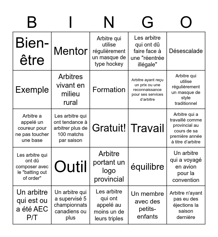 This bingo card has a free space and 24 words: Outil, Un arbitre qui a supervisé 5 championnats canadiens ou plus, Formation, Un arbitre qui est ou a été AEC P/T, Désescalade, Bien-être, Exemple, Mentor, Travail, Arbitre portant un logo provincial, Arbitre ayant reçu un prix ou une reconnaissance pour ses services d’arbitre, Arbitre a appelé un coureur pour ne pas toucher une base, équilibre, Un arbitre qui a voyagé en avion pour la convention, Arbitres vivant en milieu rural, Un membre avec des petits-enfants, Arbitre qui a travaillé comme provincial au cours de sa première année à titre d’arbitre, Arbitre qui utilise régulièrement un masque de type hockey, Arbitre qui utilise régulièrement un masque de style traditionnel, Les arbitre qui ont tendance à arbitrer plus de 100 matchs par saison, Arbitre n'ayant pas eu des éjections la saison dernière, Les arbitre qui ont dû composer avec le "batting out of order", Les arbitre qui ont dû faire face à une "réentrée illégale" and Les arbitre qui ont appelé au moins un de leurs triples.