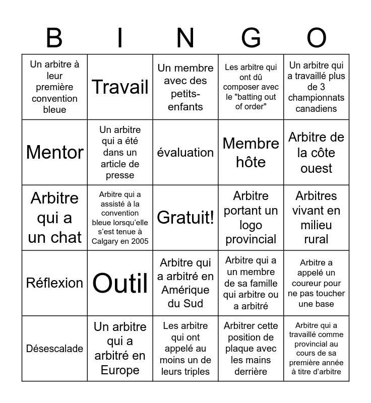 This bingo card has a free space and 24 words: Outil, Un arbitre qui a arbitré en Europe, évaluation, Désescalade, Un arbitre qui a travaillé plus de 3 championnats canadiens, Un arbitre à leur première convention bleue, Mentor, Travail, Arbitre portant un logo provincial, Arbitre qui a arbitré en Amérique du Sud, Membre hôte, Arbitre qui a un chat, Arbitre qui a un membre de sa famille qui arbitre ou a arbitré, Arbitre a appelé un coureur pour ne pas toucher une base, Un arbitre qui a été dans un article de presse, Arbitrer cette position de plaque avec les mains derrière, Arbitres vivant en milieu rural, Un membre avec des petits-enfants, Arbitre de la côte ouest, Arbitre qui a assisté à la convention bleue lorsqu’elle s’est tenue à Calgary en 2005, Arbitre qui a travaillé comme provincial au cours de sa première année à titre d’arbitre, Réflexion, Les arbitre qui ont dû composer avec le "batting out of order" and Les arbitre qui ont appelé au moins un de leurs triples.