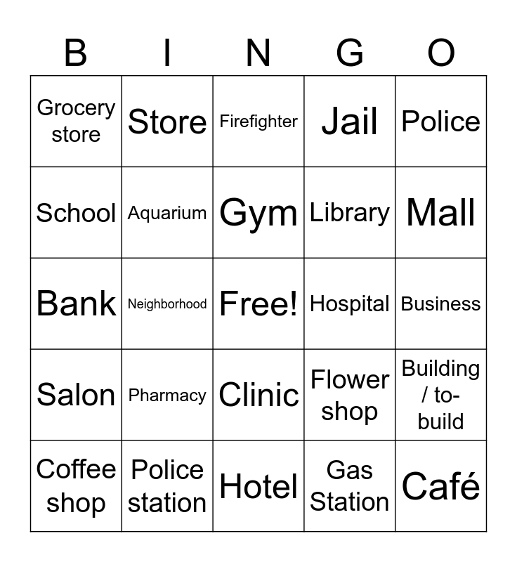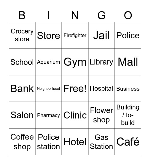 This bingo card has a free space and 43 words: Restaurant, Café, Bakery, Coffee shop, Fast food, Gas Station, Firefighter, Fire station, Police, Police station, Jail, Hospital, Clinic, Pharmacy, Post office, Hotel, Museum, Bank, Movie theater, Mall, Store, Shoe store, Clothing store, Grocery store, Agency, Business, Busy, Car dealership, Flower shop, Salon, Groomer, Building / to-build, Parking lot, Neighborhood, Home, Church, Office, Gym, School, Library, Park, Aquarium and Zoo.