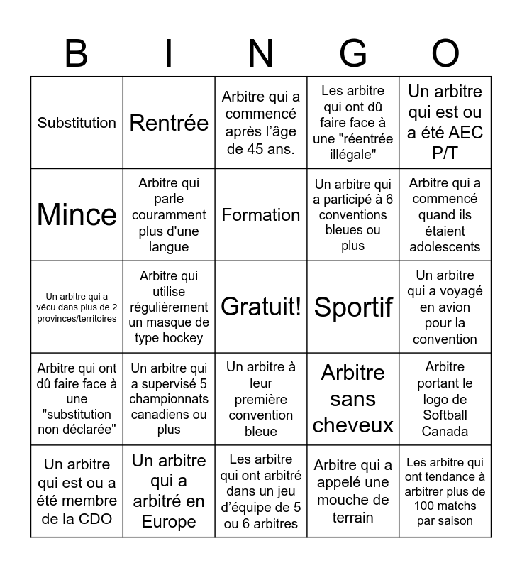 This bingo card has a free space and 24 words: Un arbitre qui a supervisé 5 championnats canadiens ou plus, Un arbitre qui a arbitré en Europe, Formation, Un arbitre qui est ou a été membre de la CDO, Un arbitre qui est ou a été AEC P/T, Substitution, Mince, Rentrée, Sportif, Un arbitre à leur première convention bleue, Un arbitre qui a participé à 6 conventions bleues ou plus, Un arbitre qui a vécu dans plus de 2 provinces/territoires, Arbitre sans cheveux, Arbitre portant le logo de Softball Canada, Arbitre qui parle couramment plus d'une langue, Arbitre qui a appelé une mouche de terrain, Un arbitre qui a voyagé en avion pour la convention, Arbitre qui a commencé après l’âge de 45 ans., Arbitre qui a commencé quand ils étaient adolescents, Arbitre qui utilise régulièrement un masque de type hockey, Les arbitre qui ont tendance à arbitrer plus de 100 matchs par saison, Arbitre qui ont dû faire face à une "substitution non déclarée", Les arbitre qui ont dû faire face à une "réentrée illégale" and Les arbitre qui ont arbitré dans un jeu d’équipe de 5 ou 6 arbitres.