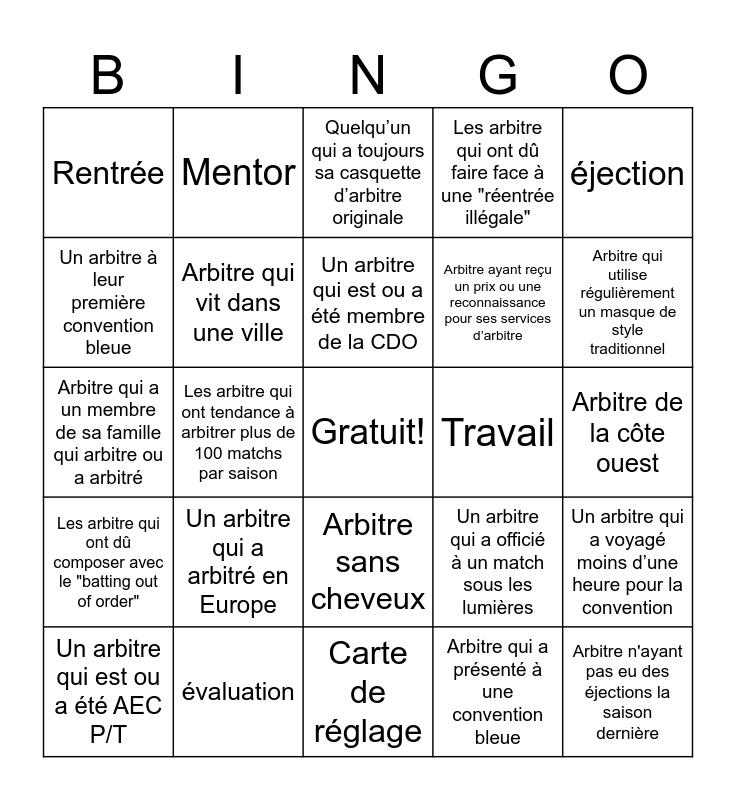This bingo card has a free space and 24 words: Un arbitre qui a arbitré en Europe, évaluation, Un arbitre qui est ou a été membre de la CDO, Un arbitre qui est ou a été AEC P/T, éjection, Rentrée, Un arbitre à leur première convention bleue, Mentor, Travail, Arbitre sans cheveux, Arbitre ayant reçu un prix ou une reconnaissance pour ses services d’arbitre, Arbitre qui a un membre de sa famille qui arbitre ou a arbitré, Un arbitre qui a officié à un match sous les lumières, Un arbitre qui a voyagé moins d’une heure pour la convention, Arbitre qui vit dans une ville, Arbitre qui a présenté à une convention bleue, Arbitre de la côte ouest, Quelqu’un qui a toujours sa casquette d’arbitre originale, Arbitre qui utilise régulièrement un masque de style traditionnel, Les arbitre qui ont tendance à arbitrer plus de 100 matchs par saison, Arbitre n'ayant pas eu des éjections la saison dernière, Les arbitre qui ont dû composer avec le "batting out of order", Les arbitre qui ont dû faire face à une "réentrée illégale" and Carte de réglage.