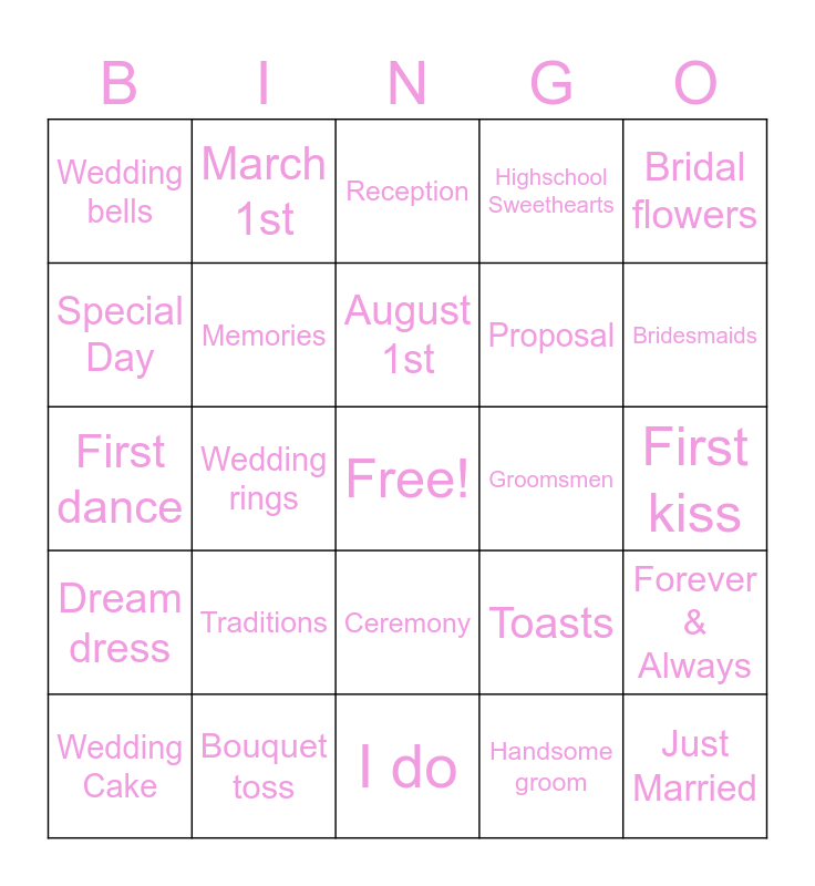 This bingo card has a free space and 29 words: Wedding Cake, Beautiful Bride, Wedding rings, Honeymoon, Wedding bells, Reception, Memories, Traditions, Groomsmen, Bouquet toss, First kiss, Just Married, I do, Handsome groom, Bridesmaids, Matrimony, Ceremony, Dream dress, Bridal flowers, First dance, Toasts, Marriage advice, Proposal, Special Day, Highschool Sweethearts, March 1st, Forever & Always, August 1st and Best friend.