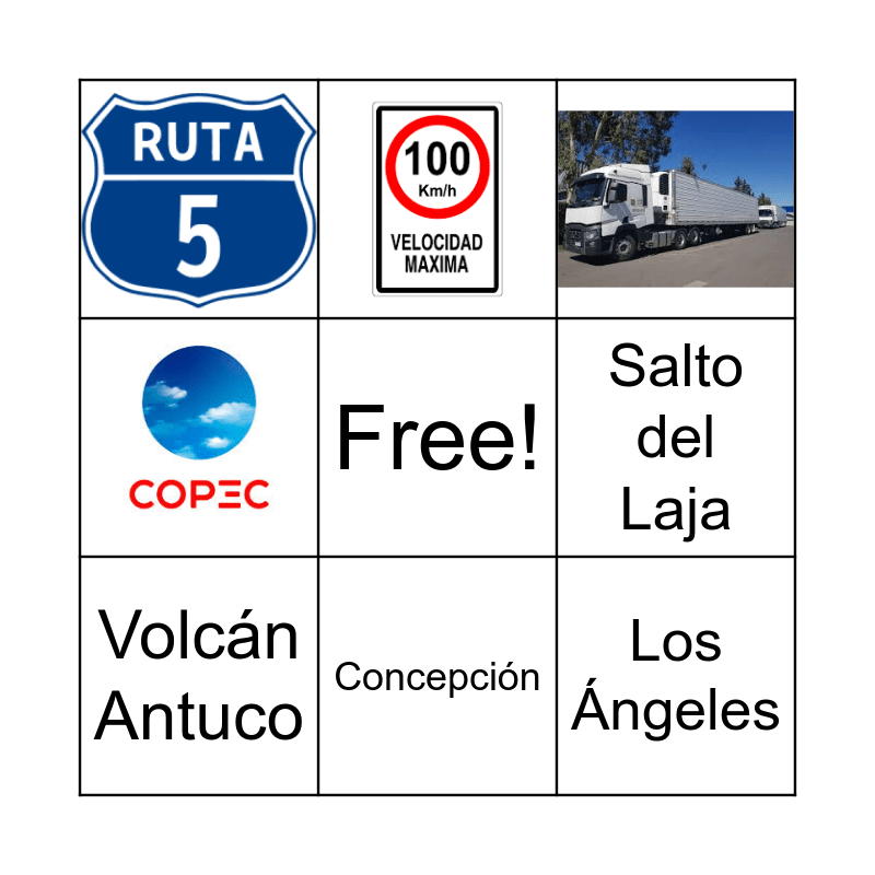 This bingo card has 6 images, a free space and 4 words: Concepción, Salto del Laja, Volcán Antuco and Los Ángeles.