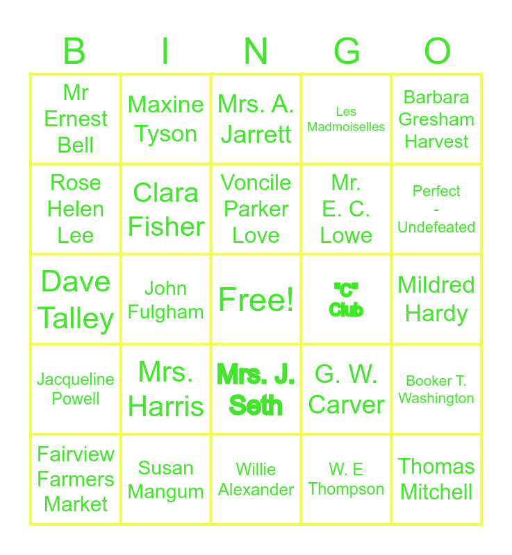 This bingo card has a free space and 24 words: Mrs. Harris, Susan Mangum, Voncile Parker Love, Fairview Farmers Market, Barbara Gresham Harvest, Mr Ernest Bell, Rose Helen Lee, Maxine Tyson, "C" Club, Mrs. J. Seth, Mr. E. C. Lowe, Dave Talley, G. W. Carver, Booker T. Washington, Clara Fisher, W. E Thompson, Mildred Hardy, Mrs. A. Jarrett, Perfect - Undefeated, John Fulgham, Thomas Mitchell, Jacqueline Powell, Les Madmoiselles and Willie Alexander.