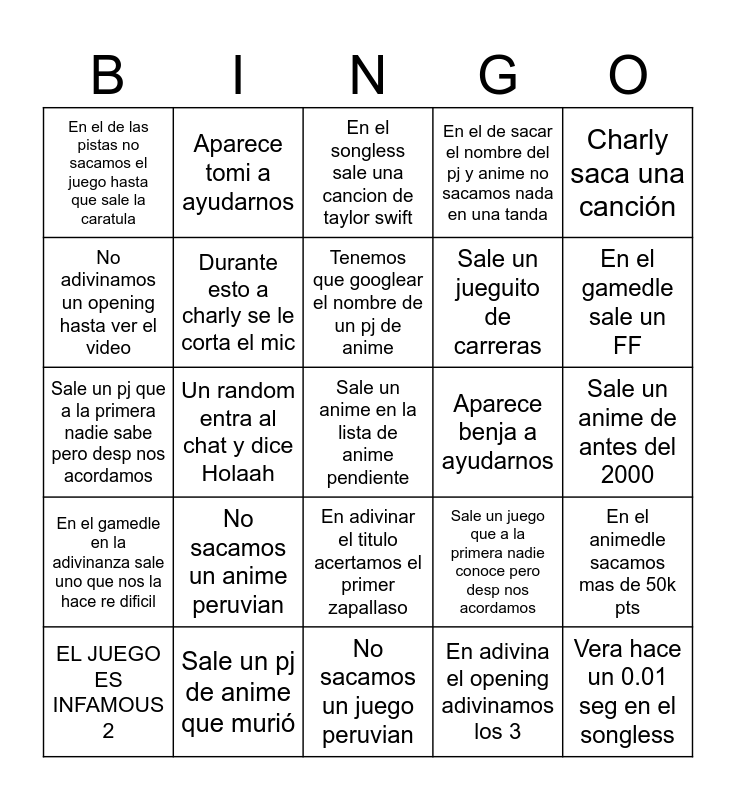 This bingo card has 25 words: No sacamos un anime peruvian, No sacamos un juego peruvian, Tenemos que googlear el nombre de un pj de anime, EL JUEGO ES INFAMOUS 2, Charly saca una canción, En el de las pistas no sacamos el juego hasta que sale la caratula, No adivinamos un opening hasta ver el video, Aparece tomi a ayudarnos, Aparece benja a ayudarnos, En adivinar el titulo acertamos el primer zapallaso, Sale un jueguito de carreras, Sale un pj que a la primera nadie sabe pero desp nos acordamos, Sale un juego que a la primera nadie conoce pero desp nos acordamos, En el animedle sacamos mas de 50k pts, Durante esto a charly se le corta el mic, Vera hace un 0.01 seg en el songless, Sale un anime de antes del 2000, En el songless sale una cancion de taylor swift, En el gamedle sale un FF, Un random entra al chat y dice Holaah, Sale un anime en la lista de anime pendiente, Sale un pj de anime que murió, En el gamedle en la adivinanza sale uno que nos la hace re dificil, En el de sacar el nombre del pj y anime no sacamos nada en una tanda and En adivina el opening adivinamos los 3.