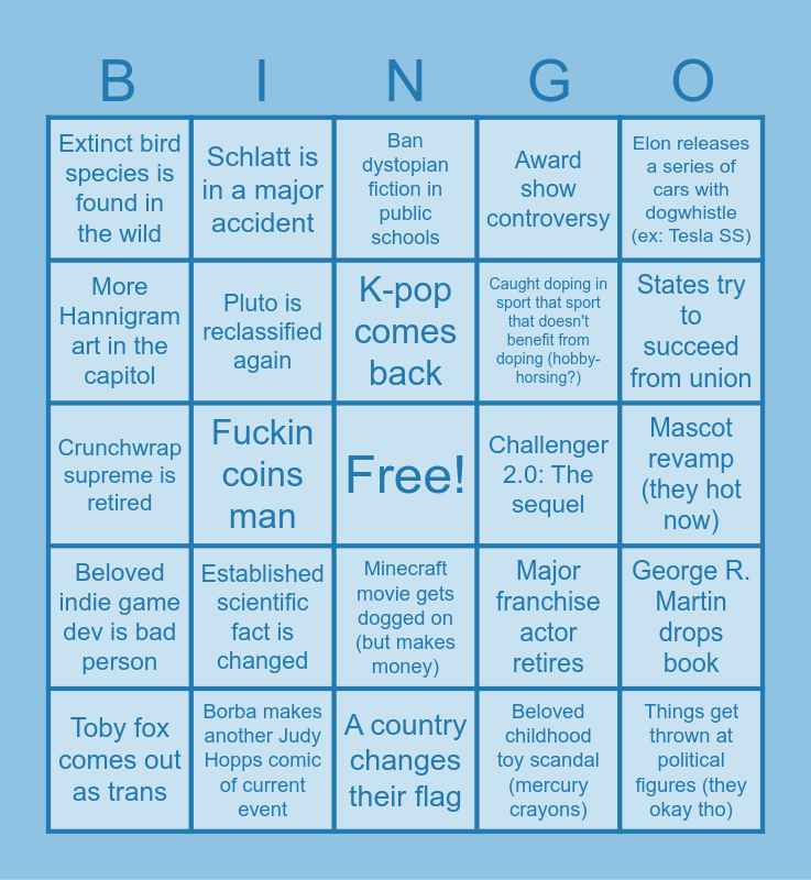 This bingo card has a free space and 24 words: Established scientific fact is changed, Borba makes another Judy Hopps comic of current event, K-pop comes back, Toby fox comes out as trans, Elon releases a series of cars with dogwhistle (ex: Tesla SS), Extinct bird species is found in the wild, More Hannigram art in the capitol, Schlatt is in a major accident, Challenger 2.0: The sequel, Minecraft movie gets dogged on (but makes money), Caught doping in sport that sport that doesn't benefit from doping (hobby-horsing?), Crunchwrap supreme is retired, Major franchise actor retires, George R. Martin drops book, Pluto is reclassified again, Beloved childhood toy scandal (mercury crayons), Mascot revamp (they hot now), Ban dystopian fiction in public schools, States try to succeed from union, Fuckin coins man, Things get thrown at political figures (they okay tho), Beloved indie game dev is bad person, Award show controversy and A country changes their flag.