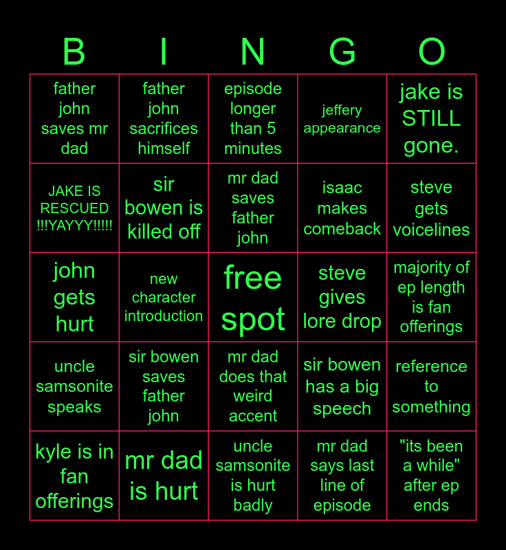 This bingo card has a free space and 38 words: father john gets killed off, mr dad is included in a flashback, sir bowen has a fight with samsonite, isaac makes comeback, reference to something, uncle samsonite speaks, new character introduction, mr dad gets hurt, jeffery appearance, steve gets voicelines, JAKE IS RESCUED !!!YAYYY!!!!!, father john sacrifices himself, sir bowen has a big speech, john gets hurt, sir bowen is killed off, mr dad saves father john, john lives, jake is STILL gone., lore drop, sir bowen saves father john, episode longer than 5 minutes, jaketv releases ep on time, majority of ep length is fan offerings, kyle is in fan offerings, no new character :(, mr dad does that weird accent, father john has a big monologue, samsonite kills off one of the characters, sir bowen dies, dance-off, father john says the first line of episode, mr dad says last line of episode, "its been a while" after ep ends, father john saves mr dad, mr dad is hurt, uncle samsonite is hurt badly, steve gives lore drop and sir bowen, father john and mr dad all go to the domain.