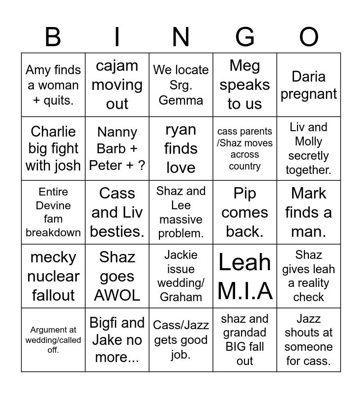 This bingo card has a free space and 29 words: Argument at wedding/called off., Meg gets fired., Cass and Liv besties., Grace and Cameron split up., Amy finds a woman + quits., We locate Srg. Gemma, Nanny Barb + Peter + ?, Shaz goes AWOL, Pip comes back., Bigfi and Jake no more..., Mark finds a man., Jazz shouts at someone for cass., Cass/Jazz gets good job., shaz and grandad BIG fall out, Liv and Molly secretly together., Leah Craftclub argument. Leah put in her place., Jackie issue wedding/ Graham, mecky nuclear fallout, Daria pregnant, Entire Devine fam breakdown, Leah M.I.A, Steelband big fight., cass parents /Shaz moves across country, Charlie big fight with josh, Meg speaks to us, cajam moving out, Shaz gives leah a reality check, ryan finds love and Lee quits his job.