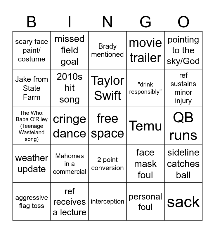 This bingo card has a free space and 47 words: fight, sack, fumble, interception, Mahomes in a commercial, dog, missed field goal, "This is (for) the super bowl!!", Jake from State Farm, soda sweep (Coke, Dr., & Pepsi), 2010s hit song, movie trailer, sideline catches ball, face mask foul, pyrotechnics, Harrison Ford, Taylor Swift, Temu, any VPN, pointing to the sky/God, cringe dance, personal foul, scary face paint/ costume, "drink responsibly", men sitting too close for comfort, ref sustains minor injury, aggressive flag toss, X (formally Twitter) icon, 2 point conversion, weather update, one-handed catch, play challenge, holding, QR code, AI/ robot, ref receives a lecture, QB runs, Jesus/ God mentioned, late night show host, announcer clearly reading from a script, someone squirts Gatorade into someone else's mouth, Brady mentioned, The Who: Baba O'Riley (Teenage Wasteland song), electric or hybrid vehicle, "three-peat", awkward coach/ player interview and Snoop Dogg.