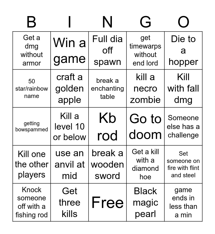 This bingo card has 25 words: Kill one the other players, Get three kills, Kb rod, Black magic pearl, Die to a hopper, Get a dmg without armor, Win a game, Full dia off spawn, Go to doom, Set someone on fire with flint and steel, 50 star/rainbow name, craft a golden apple, Free, Get a kill with a diamond hoe, Kill with fall dmg, Knock someone off with a fishing rod, Kill a level 10 or below, break a enchanting table, kill a necro zombie, Someone else has a challenge, getting bowspammed, use an anvil at mid, break a wooden sword, get timewarps without end lord and game ends in less than a min.