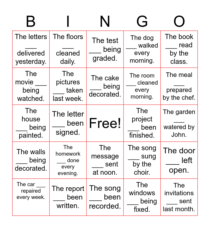 This bingo card has a free space and 24 words: The homework ___ done every evening., The report ___ been written., The cake ___ being decorated., The car ___ repaired every week., The book ___ read by the class., The letters ___ delivered yesterday., The movie ___ being watched., The floors ___ cleaned daily., The project ___ been finished., The message ___ sent at noon., The room ___ cleaned every morning., The house ___ being painted., The song ___ sung by the choir., The door ___ left open., The pictures ___ taken last week., The windows ___ being fixed., The garden ___ watered by John., The test ___ being graded., The meal ___ prepared by the chef., The letter ___ been signed., The invitations ___ sent last month., The walls ___ being decorated., The dog ___ walked every morning. and The song ___ been recorded..