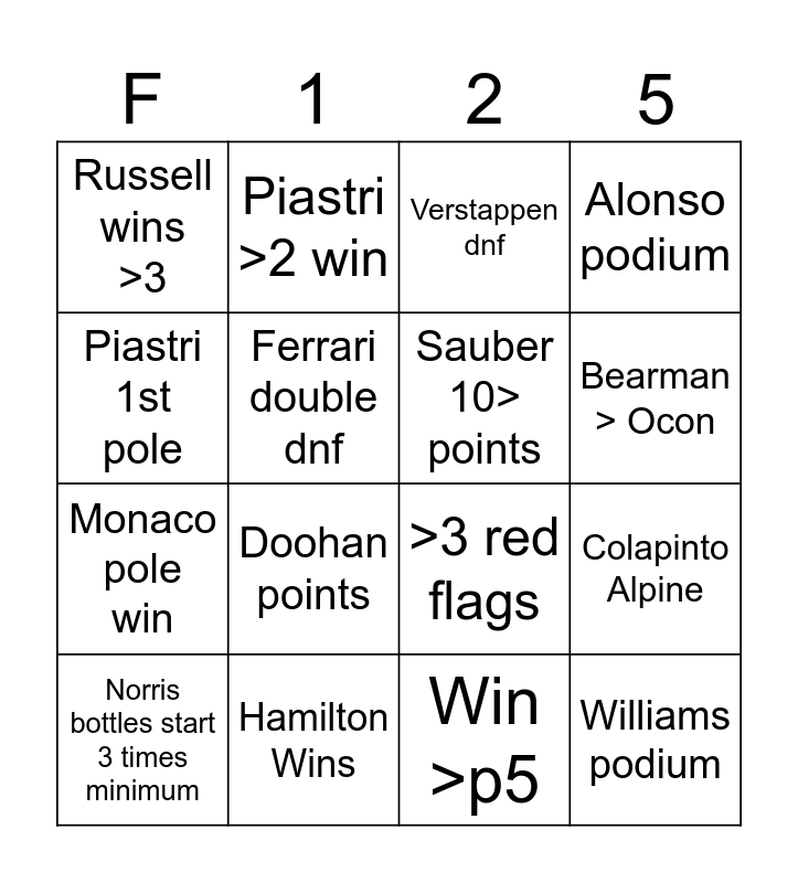 This bingo card has 16 words: Hamilton Wins, Colapinto Alpine, Verstappen dnf, Russell wins >3, Monaco pole win, Piastri >2 win, >3 red flags, Win >p5, Piastri 1st pole, Ferrari double dnf, Norris bottles start 3 times minimum, Alonso podium, Doohan points, Bearman > Ocon, Sauber 10> points and Williams podium.