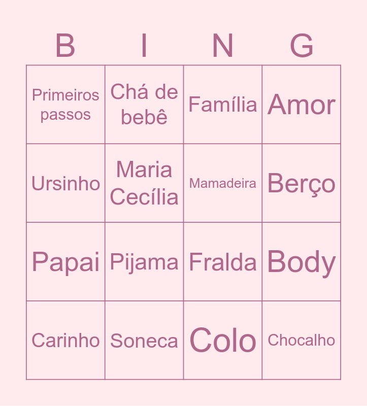This bingo card has 40 words: Free!, Fralda, Chupeta, Mamadeira, Babador, Carrinho, Berço, Roupinha, Ursinho, Chocalho, Body, Amor, Carinho, Colo, Soneca, Risada, Chorinho, Primeiros passos, Fofura, Família, Gratidão, Mamãe, Papai, Maria Cecília, Bebê, Menina, Princesa, Pequena, Anjo, Doçura, Banho, Lencinho, Mordedor, Almofada, Pijama, Maternidade, Primeiros dentinhos, Canção de ninar, Chá de bebê and Amizade.
