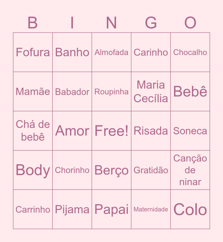 This bingo card has a free space and 39 words: Fralda, Chupeta, Mamadeira, Babador, Carrinho, Berço, Roupinha, Ursinho, Chocalho, Body, Amor, Carinho, Colo, Soneca, Risada, Chorinho, Primeiros passos, Fofura, Família, Gratidão, Mamãe, Papai, Maria Cecília, Bebê, Menina, Princesa, Pequena, Anjo, Doçura, Banho, Lencinho, Mordedor, Almofada, Pijama, Maternidade, Primeiros dentinhos, Canção de ninar, Chá de bebê and Amizade.