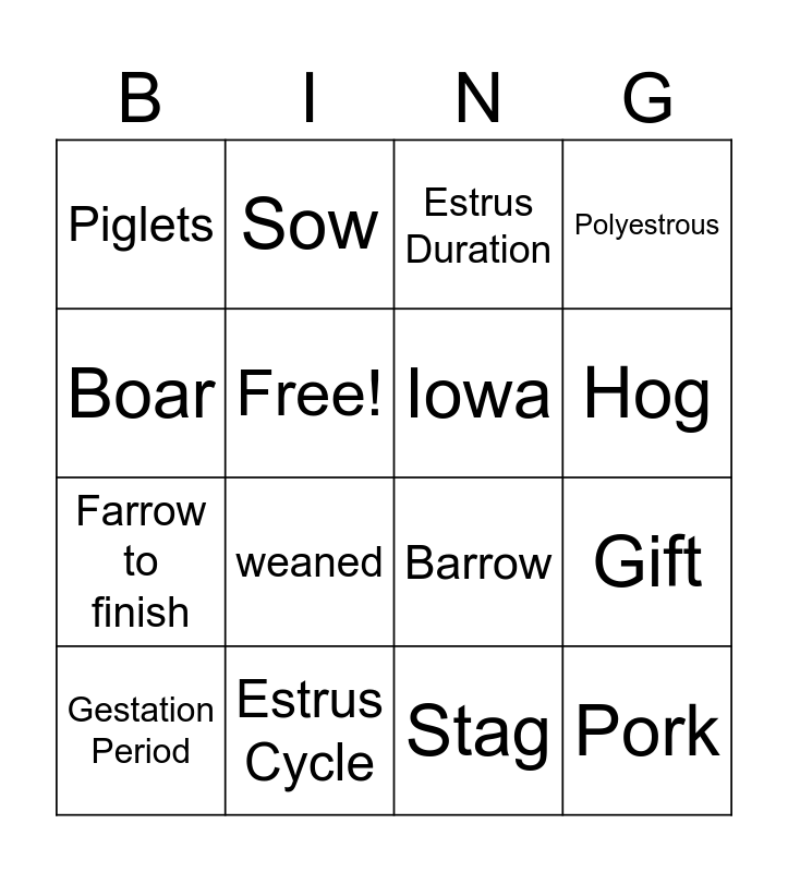 This bingo card has 16 words: Gestation Period, Estrus Cycle, Estrus Duration, Polyestrous, Boar, Sow, Barrow, Gift, Piglets, Free!, Stag, Hog, Farrow to finish, weaned, Iowa and Pork.