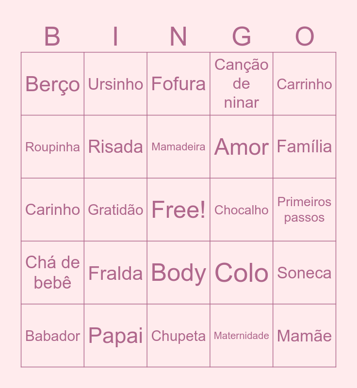This bingo card has a free space and 25 words: Fralda, Chupeta, Mamadeira, Babador, Carrinho, Berço, Roupinha, Ursinho, Chocalho, Body, Amor, Carinho, Colo, Soneca, Risada, Chorinho, Primeiros passos, Fofura, Família, Gratidão, Mamãe, Papai, Chá de bebê, Canção de ninar and Maternidade.