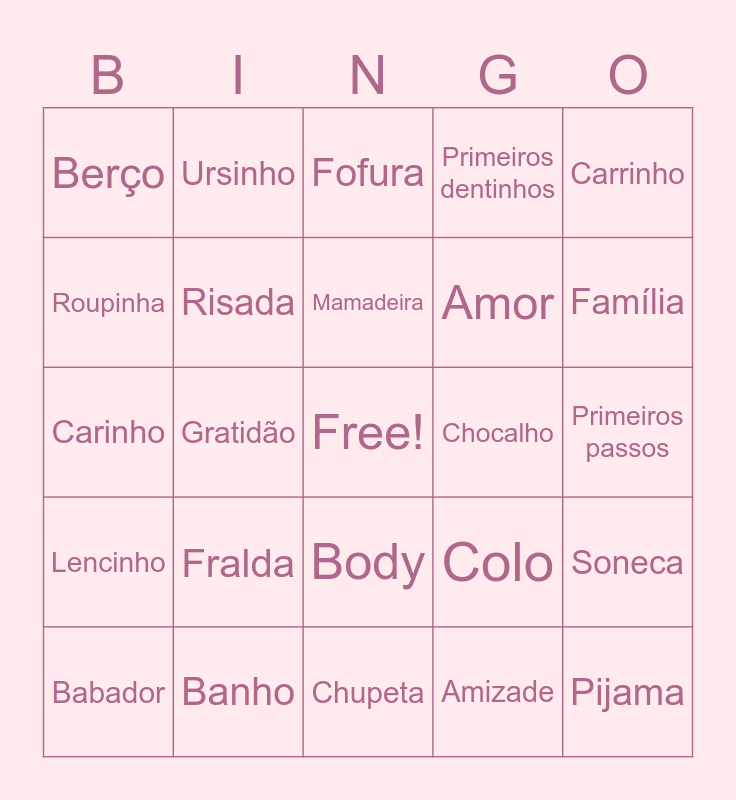This bingo card has a free space and 25 words: Fralda, Chupeta, Mamadeira, Babador, Carrinho, Berço, Roupinha, Ursinho, Chocalho, Body, Amor, Carinho, Colo, Soneca, Risada, Chorinho, Primeiros passos, Fofura, Família, Gratidão, Pijama, Banho, Lencinho, Primeiros dentinhos and Amizade.