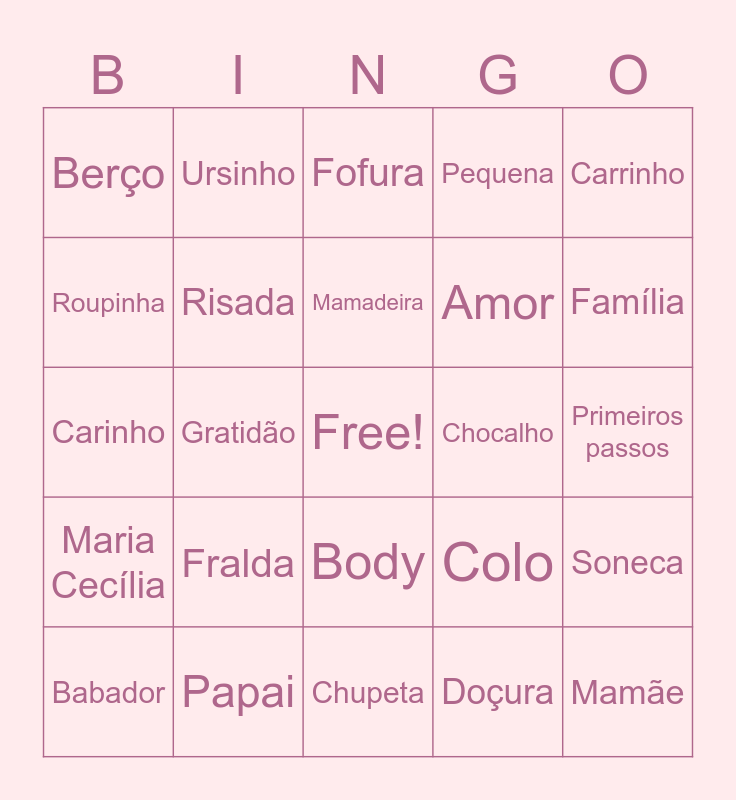 This bingo card has a free space and 25 words: Fralda, Chupeta, Mamadeira, Babador, Carrinho, Berço, Roupinha, Ursinho, Chocalho, Body, Amor, Carinho, Colo, Soneca, Risada, Chorinho, Primeiros passos, Fofura, Família, Gratidão, Mamãe, Papai, Maria Cecília, Pequena and Doçura.