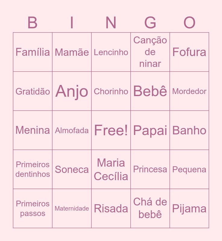 This bingo card has a free space and 25 words: Soneca, Risada, Chorinho, Primeiros passos, Fofura, Família, Gratidão, Mamãe, Papai, Maria Cecília, Bebê, Menina, Princesa, Pequena, Anjo, Doçura, Banho, Lencinho, Mordedor, Almofada, Pijama, Maternidade, Primeiros dentinhos, Canção de ninar and Chá de bebê.