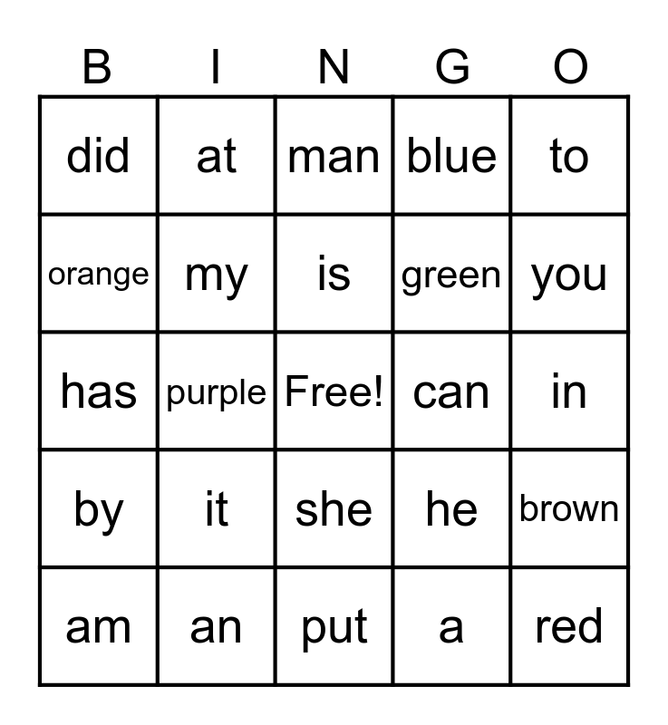 This bingo card has a free space and 34 words: the, a, see, I, by, my, to, am, at, go, is, man, no, and, can, you, an, has, it, he, she, ran, did, in, put, red, blue, yellow, green, orange, black, purple, brown and pink.