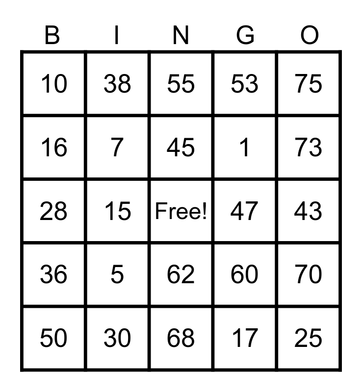 This bingo card has a free space and 24 words: 5, 30, 45, 50, 75, 10, 16, 38, 47, 62, 1, 28, 60, 70, 7, 17, 43, 55, 73, 15, 25, 36, 53 and 68.