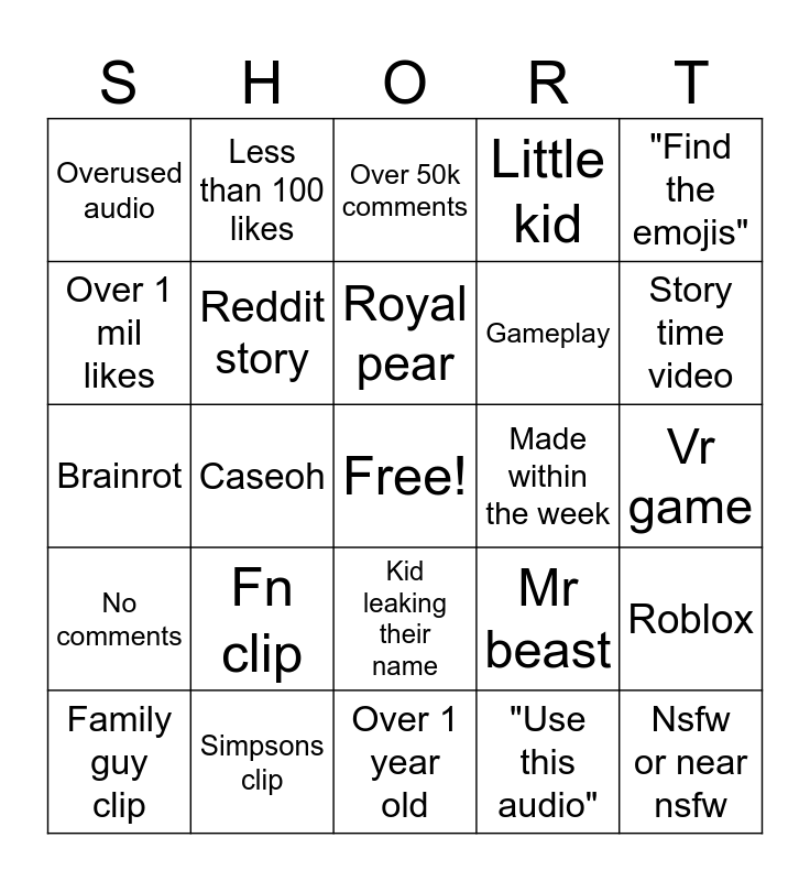 This bingo card has a free space and 27 words: Mr beast, Minecraft, Gameplay, Over 1 year old, Over 1 mil likes, Over 50k comments, Less than 100 likes, No comments, Made within the week, Roblox, Brainrot, Little kid, Family guy clip, Simpsons clip, Story time video, Crappy mobile game, Reddit story, Royal pear, Fn clip, Overused audio, Vr game, "Use this audio", Caseoh, Nsfw or near nsfw, Kid leaking their name, "Find the emojis" and Tiktok filter.