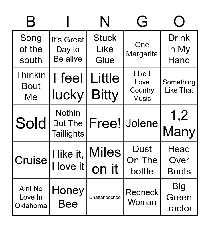 This bingo card has a free space and 72 words: Thank God I’m A country Boy, It’s Great Day to Be alive, Nothin But The Taillights, Knee Deep, Broadway Girl, Body Like A Backroad, One Margarita, Daddy's money, Like I Love Country Music, One Thing At A Time, Aint No Love In Oklahoma, Boot Scootin Boogie, Something Like That, Song of the south, All My Ex’s live in Texas, Sold, Dust On The bottle, Drink in My Hand, Beer Never Broke My Heart, 1,2 Many, I like it, I love it, Big Green tractor, Head Over Boots, Beer for my Horses, Should’ve been a cowboy, She’s Country, Pour Me A Drink, Heartache Medication, Whiskey Glasses, Play it Again, Honey Bee, Knockin Boots, Watermelon Crawl, Red Solo Cup, Redneck Woman, Don’t Rock The Jukebox, Heads Carolina, Tails California, When It Rains It Pours, Thinkin Bout Me, American Kids, Miles on it, I Had Some Help, Cowgirls, Wagon Wheel, Spin you Around, Cruise, Somthin Bad, Mama’s Broken Heart, Louisiana Woman, Mississippi Man, On the road again, Bad,Bad Leroy Brown, Any Man of Mine, Your Man, Jolene, Why Don’t We just Dance, Take me Home Country Roads, Stuck Like Glue, Little Bitty, Fact, I’m A survivor, These Boots Are Made for Walkin, Save a Horse, Country Girl, Chattahoochee, Friends In Low Places, Don’t Come Home A Drinkin, I feel lucky, This Kiss, Burnin Love, Texas, You look like you love me and You Proof.