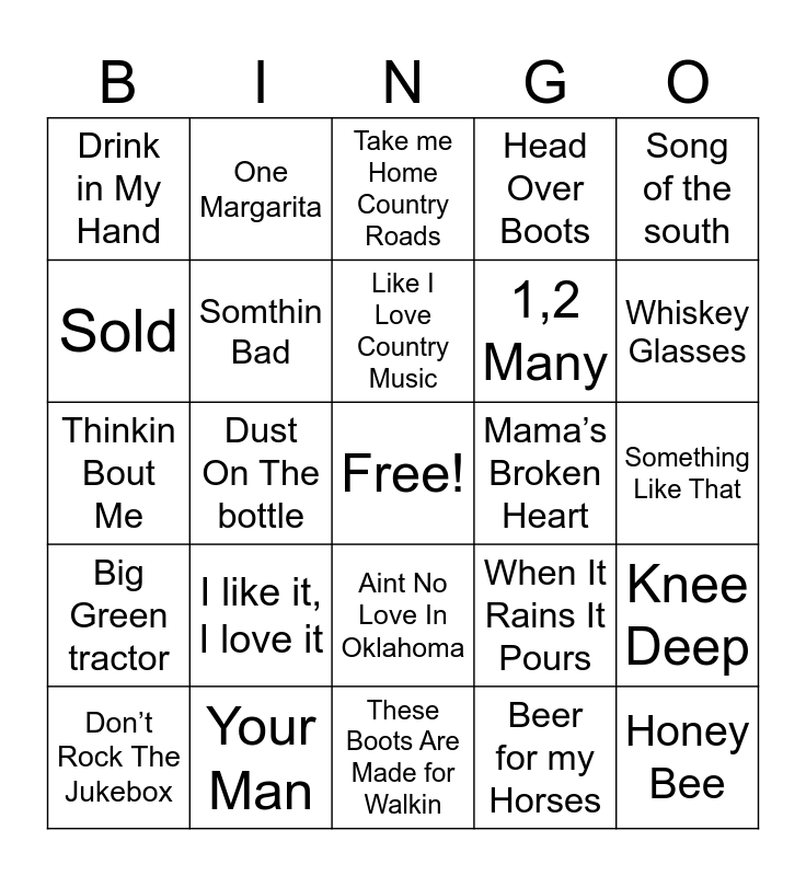 This bingo card has a free space and 67 words: Thank God I’m A country Boy, It’s Great Day to Be alive, Nothin But The Taillights, Knee Deep, Broadway Girl, Body Like A Backroad, One Margarita, Daddy's money, Like I Love Country Music, One Thing At A Time, Aint No Love In Oklahoma, Boot Scootin Boogie, Something Like That, Song of the south, All My Ex’s live in Texas, Sold, Dust On The bottle, Drink in My Hand, Beer Never Broke My Heart, 1,2 Many, I like it, I love it, Big Green tractor, Head Over Boots, Beer for my Horses, Should’ve been a cowboy, She’s Country, Pour Me A Drink, Heartache Medication, Whiskey Glasses, Play it Again, Honey Bee, Knockin Boots, Watermelon Crawl, Red Solo Cup, Redneck Woman, Don’t Rock The Jukebox, Heads Carolina, Tails California, When It Rains It Pours, Thinkin Bout Me, American Kids, Miles on it, Somthin Bad, Mama’s Broken Heart, Louisiana Woman, Mississippi Man, On the road again, Bad,Bad Leroy Brown, Any Man of Mine, Your Man, Jolene, Why Don’t We just Dance, Take me Home Country Roads, Stuck Like Glue, Little Bitty, Fact, I’m A survivor, These Boots Are Made for Walkin, Save a Horse, Country Girl, Chattahoochee, Friends In Low Places, Don’t Come Home A Drinkin, I feel lucky, This Kiss, Burnin Love, Texas, You look like you love me and You Proof.