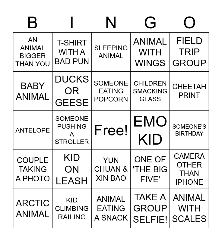 This bingo card has a free space and 24 words: KID ON LEASH, KID CLIMBING RAILING, SOMEONE EATING POPCORN, ARCTIC ANIMAL, FIELD TRIP GROUP, AN ANIMAL BIGGER THAN YOU, BABY ANIMAL, T-SHIRT WITH A BAD PUN, EMO KID, YUN CHUAN & XIN BAO, CHILDREN SMACKING GLASS, ANTELOPE, ONE OF 'THE BIG FIVE', CAMERA OTHER THAN IPHONE, DUCKS OR GEESE, TAKE A GROUP SELFIE!, SOMEONE'S BIRTHDAY, SLEEPING ANIMAL, CHEETAH PRINT, SOMEONE PUSHING A STROLLER, ANIMAL WITH SCALES, COUPLE TAKING A PHOTO, ANIMAL WITH WINGS and ANIMAL EATING A SNACK.