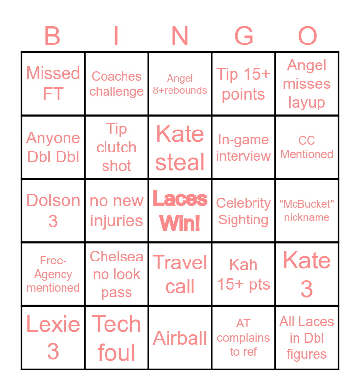 This bingo card has a free space and 24 words: Lexie 3, Chelsea no look pass, Kate steal, AT complains to ref, Angel misses layup, Missed FT, Coaches challenge, Angel 8+rebounds, Celebrity Sighting, "McBucket" nickname, Dolson 3, Tip clutch shot, Kah 15+ pts, Kate 3, Anyone Dbl Dbl, Tech foul, Airball, Tip 15+ points, CC Mentioned, Free-Agency mentioned, no new injuries, Travel call, In-game interview and All Laces in Dbl figures.
