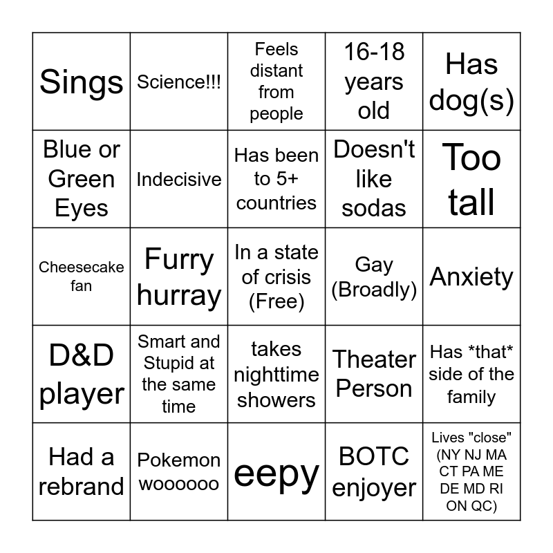This bingo card has a free space and 24 words: Smart and Stupid at the same time, Pokemon woooooo, Has been to 5+ countries, Had a rebrand, Has dog(s), Sings, Blue or Green Eyes, Science!!!, Gay (Broadly), takes nighttime showers, Doesn't like sodas, Cheesecake fan, Theater Person, Has *that* side of the family, Indecisive, BOTC enjoyer, Anxiety, Feels distant from people, Too tall, Furry hurray, Lives "close" (NY NJ MA CT PA ME DE MD RI ON QC), D&D player, 16-18 years old and eepy.