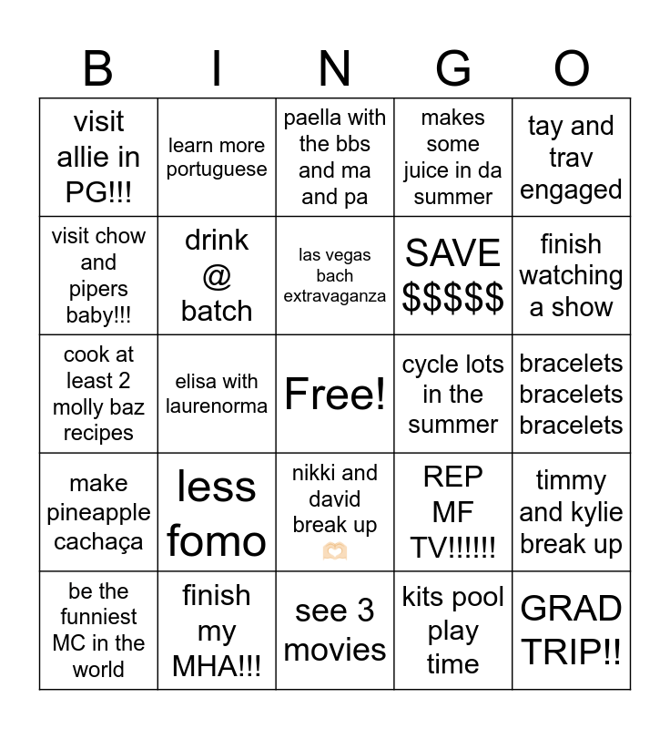 This bingo card has a free space and 24 words: less fomo, finish my MHA!!!, las vegas bach extravaganza, be the funniest MC in the world, tay and trav engaged, visit allie in PG!!!, visit chow and pipers baby!!!, learn more portuguese, cycle lots in the summer, nikki and david break up 🫶🏻, SAVE $$$$$, cook at least 2 molly baz recipes, REP MF TV!!!!!!, timmy and kylie break up, drink @ batch, kits pool play time, bracelets bracelets bracelets, paella with the bbs and ma and pa, finish watching a show, elisa with laurenorma, GRAD TRIP!!, make pineapple cachaça, makes some juice in da summer and see 3 movies.