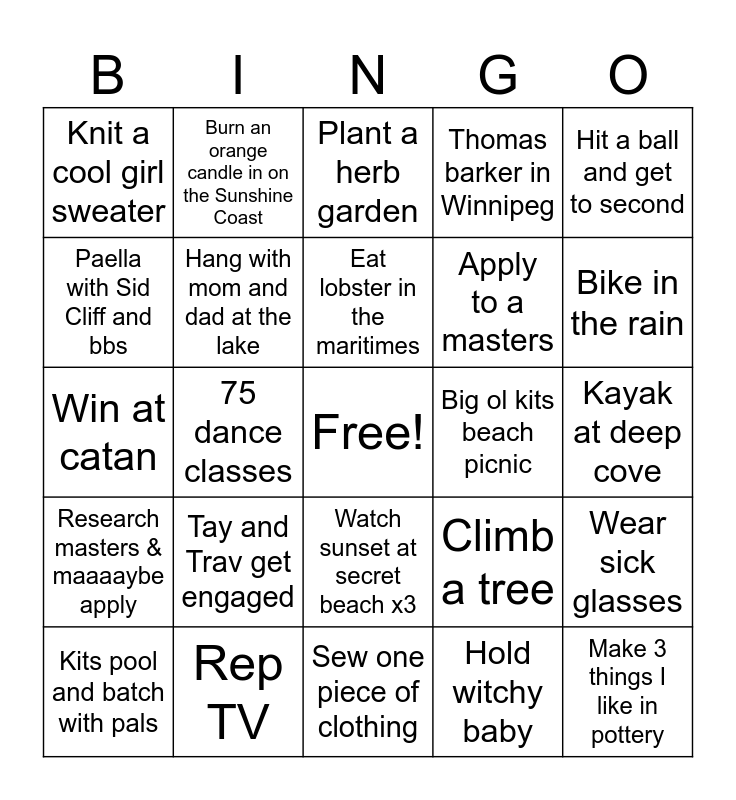 This bingo card has a free space and 24 words: Tay and Trav get engaged, Rep TV, Eat lobster in the maritimes, Kits pool and batch with pals, Hit a ball and get to second, Knit a cool girl sweater, Paella with Sid Cliff and bbs, Burn an orange candle in on the Sunshine Coast, Big ol kits beach picnic, Watch sunset at secret beach x3, Apply to a masters, Win at catan, Climb a tree, Wear sick glasses, Hang with mom and dad at the lake, Hold witchy baby, Kayak at deep cove, Plant a herb garden, Bike in the rain, 75 dance classes, Make 3 things I like in pottery, Research masters & maaaaybe apply, Thomas barker in Winnipeg and Sew one piece of clothing.