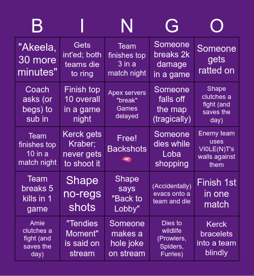 This bingo card has a free space and 49 words: Amie calls zone; team dies before last ring, Kerck bracelets into a team blindly, Shape makes Shiela sinnnnggg, Someone makes a hole joke on stream, Shape no-regs shots, Amie forgets to upgrade perks, Gets int'ed; both teams die to ring, Drives a trident off the map, Coach asks (or begs) to sub in, Team drops 10k damage collectively in one game day, Finish top 10 overall in a game night, Someone breaks 2k damage in a game, Finish 1st in one match, (Accidentally) evacs onto a team and die, (Accidentally) evacs onto a team and wins, Dies to out of bounds call, Apex servers "break" Games delayed, Someone dies while Loba shopping, Amie forgets to shoot the enemy Loba's, Someone gets ratted on, Kerck gets Kraber; never gets to shoot it, Dies to wildlife (Prowlers, Spiders, Furries), "Akeela, 30 more minutes", Someone falls off the map (tragically), "Instructions unclear", Shape clutches a fight (and saves the day), Amie clutches a fight (and saves the day), Kerck clutches a fight (and saves the day), Shape says "Back to Lobby", Team breaks 5 kills in 1 game, Team breaks 10 kills in 1 game, Team dies with 2/3 ults, Team that wipes VI0LE(N)T wins the match, "I'm going to get cooked in VOD review", "Tendies Moment" is said on stream, Kerck crafts the team due to unfortunate events, Amie performs at least 5 revives during a game, Kerck respawns the team at least twice during a game, Enemy team uses VI0LE(N)T's walls against them, Team member breaks a personal record, Shape tries to 1v3 a team, Team successfully 3-2-1's someone, Everything explodes (including TEAM VI0LEN(T), Amie successfully frag's a fight, Team finishes top 10 in a match night, Team finishes top 3 in a match night, Team wins a match night, Team lands at the wrong POI and Team wins match point finals.