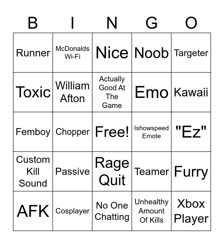 This bingo card has a free space and 24 words: Passive, Cosplayer, Actually Good At The Game, AFK, Targeter, Runner, Toxic, McDonalds Wi-Fi, Ishowspeed Emote, Rage Quit, Emo, Femboy, Teamer, Furry, William Afton, Unhealthy Amount Of Kills, "Ez", Nice, Kawaii, Chopper, Xbox Player, Custom Kill Sound, Noob and No One Chatting.