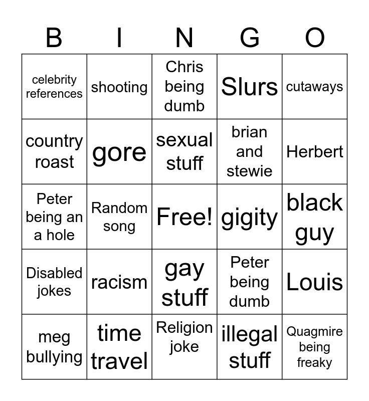 This bingo card has a free space and 24 words: racism, time travel, sexual stuff, meg bullying, cutaways, celebrity references, country roast, shooting, gigity, gay stuff, brian and stewie, Peter being an a hole, Peter being dumb, Louis, gore, illegal stuff, black guy, Chris being dumb, Herbert, Random song, Quagmire being freaky, Disabled jokes, Slurs and Religion joke.
