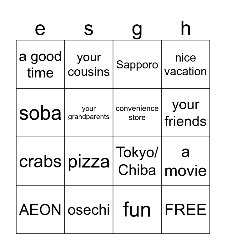 This bingo card has 16 words: osechi, a movie, Sapporo, a good time, crabs, your cousins, Tokyo/ Chiba, fun, soba, your grandparents, AEON, nice vacation, pizza, your friends, convenience store and FREE.
