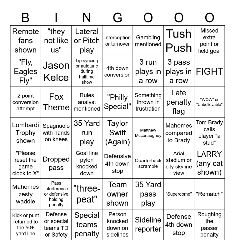 This bingo card has a free space and 48 words: 35 Yard pass play, 3 pass plays in a row, Person knocked down on sidelines, Spagnuolo with hands on knees, Rules analyst mentioned, Tom Brady calls player "a stud", "they not like us", Defense or special teams TD or Safety, Tush Push, Defensive 4th down stop, Missed extra point or field goal, Interception or turnover, Late penalty flag, Something thrown in frustration, Mahomes zesty waddle, Mahomes compared to Brady, "Fly, Eagles Fly", FIGHT, "Superdome", Gambling mentioned, 3 run plays in a row, 35 Yard run play, Remote fans shown, Jason Kelce, "Rematch", Lip syncing or autotune during halftime show, "WOW" or "Unbelievable", Kick or punt returned to the 50+ yard line, "Philly Special", Fox Theme, Defense 4th down stop, Matthew Mcconaughey, LARRY (any cat shown), Pass interference or defensive holding penalty, Lombardi Trophy shown, Quarterback scramble, Arial stadium or city skyline view, 2 point conversion attempt, Goal line pylon knocked down, "three-peat", "Please reset the game clock to X", Roughing the passer penalty, Lateral or Pitch play, Special teams penalty, 4th down conversion, Team owner shown, Dropped pass and Sideline reporter.