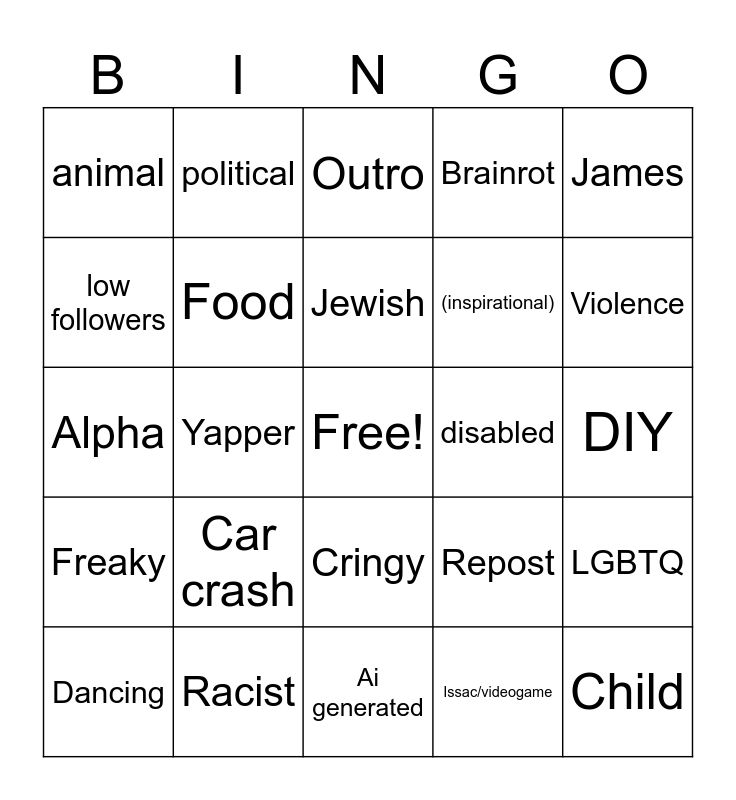 This bingo card has a free space and 24 words: Car crash, Racist, Jewish, Dancing, James, animal, low followers, political, disabled, Cringy, (inspirational), Alpha, Repost, LGBTQ, Food, Issac/videogame, DIY, Outro, Violence, Yapper, Child, Freaky, Brainrot and Ai generated.