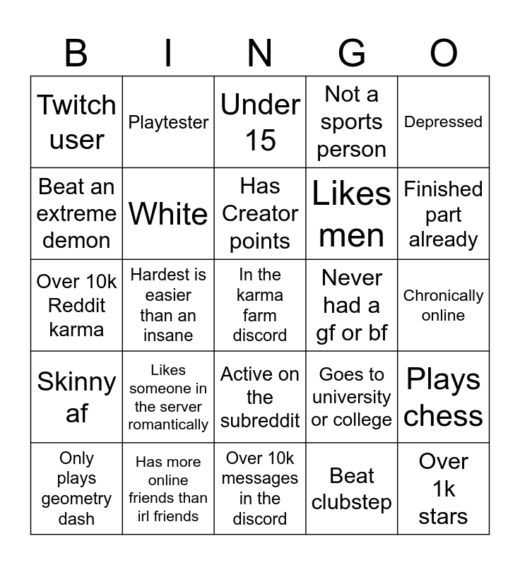 This bingo card has a free space and 24 words: Only plays geometry dash, Likes someone in the server romantically, Has Creator points, Beat clubstep, Depressed, Twitch user, Playtester, Under 15, Never had a gf or bf, Chronically online, Over 10k Reddit karma, White, Goes to university or college, Plays chess, Beat an extreme demon, Has more online friends than irl friends, Over 10k messages in the discord, Not a sports person, Finished part already, Skinny af, Hardest is easier than an insane, Active on the subreddit, Likes men and Over 1k stars.
