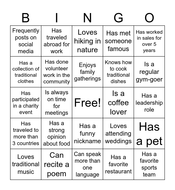 This bingo card has a free space and 25 words: Has a strong opinion about food, Can speak more than one language, Enjoys family gatherings, Loves traditional music, Has worked in sales for over 5 years, Frequently posts on social media, Has a collection of traditional clothes, Has traveled abroad for work, Is a coffee lover, Has a funny nickname, Knows how to cook traditional dishes, Has participated in a charity event, Loves attending weddings, Has a pet, Has done volunteer work in the community, Has attended team-building events, Has a leadership role, Loves hiking in nature, Is a regular gym-goer, Is always on time for meetings, Has a favorite sports team, Can recite a poem, Has traveled to more than 3 countries, Has met someone famous and Has a favorite restaurant.