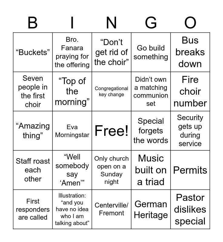 This bingo card has a free space and 29 words: First responders are called, “Jam packed”, Eva Morningstar, Bro. Evertson makes a mistake during opening, “Buckets”, “Don’t get rid of the choir”, “Top of the morning”, “Well somebody say ‘Amen’”, Special forgets the words, Illustration: “and you have no idea who I am talking about”, Security gets up during service, Pastor dislikes special, Centerville/ Fremont, German Heritage, Fire choir number, Bro. Martinez solo, Only church open on a Sunday night, Staff roast each other, Bus breaks down, “Amazing thing”, Music built on a triad, Godly young men and women, Didn’t own a matching communion set, Seven people in the first choir, Go build something, Bro. Fanara praying for the offering, Permits, Congregational key change and Kissell family singing.