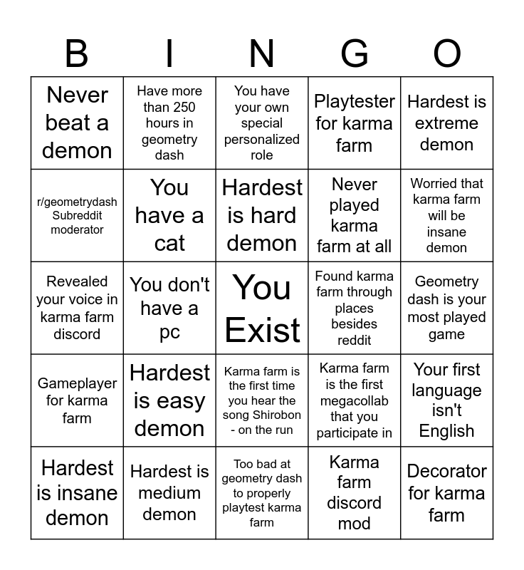 This bingo card has a free space and 24 words: Hardest is easy demon, Hardest is medium demon, Hardest is hard demon, Hardest is insane demon, Hardest is extreme demon, Never beat a demon, r/geometrydash Subreddit moderator, Have more than 250 hours in geometry dash, Found karma farm through places besides reddit, Karma farm is the first time you hear the song Shirobon - on the run, Never played karma farm at all, Revealed your voice in karma farm discord, Karma farm is the first megacollab that you participate in, Your first language isn't English, You have a cat, Karma farm discord mod, Geometry dash is your most played game, You have your own special personalized role, Worried that karma farm will be insane demon, You don't have a pc, Decorator for karma farm, Gameplayer for karma farm, Playtester for karma farm and Too bad at geometry dash to properly playtest karma farm.
