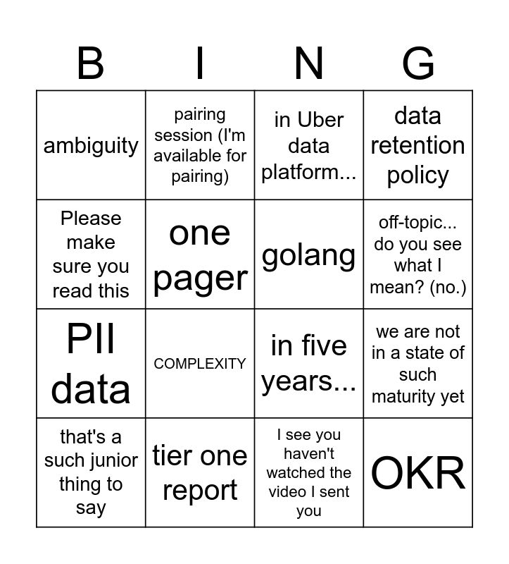 This bingo card has 20 words: that's a such junior thing to say, when I was in OLX..., in Uber data platform..., we are not in a state of such maturity yet, test-driven development!!!, COMPLEXITY, I see you haven't watched the video I sent you, data retention policy, PII data, pairing session (I'm available for pairing), in five years..., off-topic... do you see what I mean? (no.), ambiguity, tier one report, golang, understand the roadmap, Please make sure you read this, one pager, If you want to be data engineers and OKR.