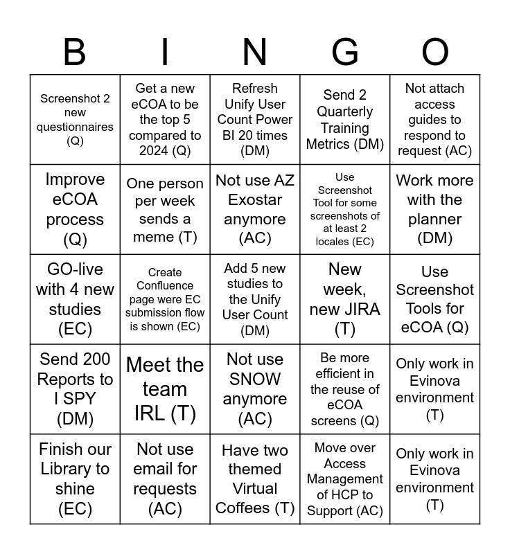 This bingo card has 26 words: Not use SNOW anymore (AC), Move over Access Management of HCP to Support (AC), Not use AZ Exostar anymore (AC), Not use email for requests (AC), Not attach access guides to respond to request (AC), Screenshot 2 new questionnaires (Q), Improve eCOA process (Q), Get a new eCOA to be the top 5 compared to 2024 (Q), Use Screenshot Tools for eCOA (Q), Be more efficient in the reuse of eCOA screens (Q), Use Screenshot Tool for some screenshots of at least 2 locales (EC), GO-live with 4 new studies (EC), Only work in Evinova environment (T), Finish our Library to shine (EC), Create Confluence page were EC submission flow is shown (EC), EC submission for an fully external study (EC), Send 2 Quarterly Training Metrics (DM), Send 200 Reports to I SPY (DM), Refresh Unify User Count Power BI 20 times (DM), Add 5 new studies to the Unify User Count (DM), Work more with the planner (DM), Have two themed Virtual Coffees (T), New week, new JIRA (T), Meet the team IRL (T), One person per week sends a meme (T) and Only work in Evinova environment (T).