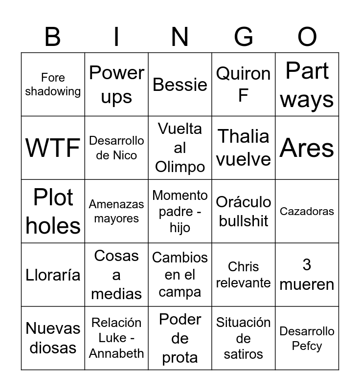 This bingo card has 25 words: Lloraría, Relación Luke - Annabeth, Momento padre - hijo, Situación de satiros, Part ways, Fore shadowing, Power ups, Bessie, Oráculo bullshit, 3 mueren, WTF, Desarrollo de Nico, Poder de prota, Chris relevante, Ares, Nuevas diosas, Amenazas mayores, Vuelta al Olimpo, Thalia vuelve, Cazadoras, Plot holes, Cosas a medias, Cambios en el campa, Quiron F and Desarrollo Pefcy.