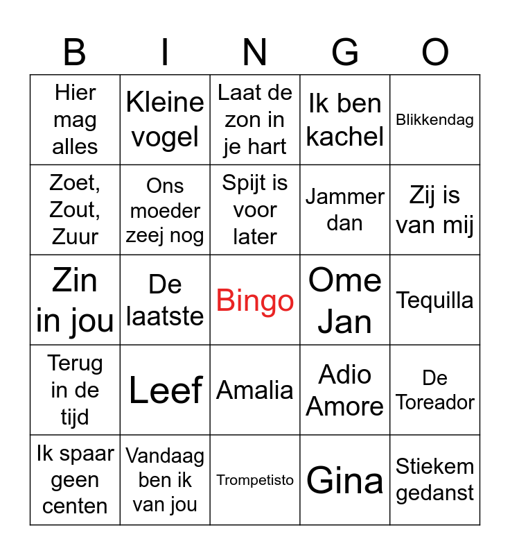 This bingo card has a free space and 24 words: Leef, Vandaag ben ik van jou, Spijt is voor later, Ik spaar geen centen, Blikkendag, Hier mag alles, Zoet, Zout, Zuur, Kleine vogel, Ome Jan, Amalia, Jammer dan, Zin in jou, Adio Amore, De Toreador, Ons moeder zeej nog, Gina, Tequilla, Laat de zon in je hart, Zij is van mij, De laatste, Stiekem gedanst, Terug in de tijd, Ik ben kachel and Trompetisto.